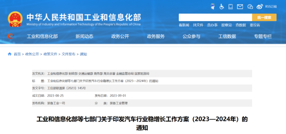 2023年9月1日,工业和信息化部等七部门印发关于《汽车行业稳增长工作方案(2023—2024年)》(以下简称《方案》)的通知。